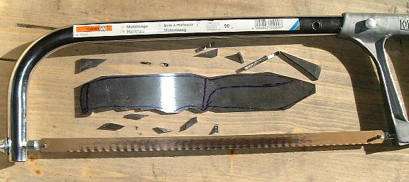 Nachdem die Kontur mittels Folienstift von Papier auf Stahl übertragen war habe ich erst einmal grob mit einer Eisensäge überflüssiges Material entfernt.