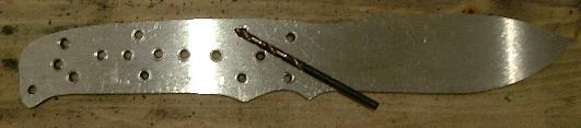 Anschließend habe ich den Griffbereich mit einigen 3mm Löchern versehen. Acht dieser Löcher sind für die Stahlstifte gedacht, die weiteren --- welche später noch auf 5mm erweitert wurden ---- dienen, neben dem Fangriemenloch, einerseits der Gewichtsersparnis (im Gegensatz zum ersten Projekt habe ich hier den Griffbereich nicht verjüngt) und andererseits werden dadurch die beiden Griffschalen später mit Kleber verbunden.