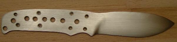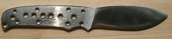 Nach knapp vier Stunden sieht das Ganze schon etwas nach einem Messer aus. Die mittleren Löcher, sowie die Fangriemenöse sind auf 5mm erweitert und angephast und der Klingenschliff ist vollbracht.