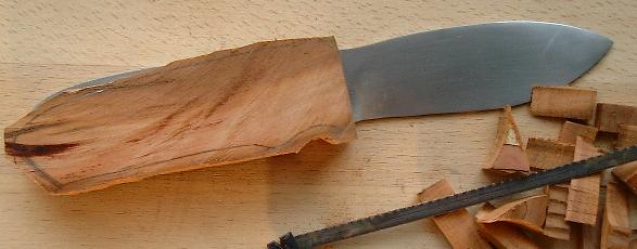 Nun war es an der Zeit sich der Holzbearbeitung zuzuwenden. Als erstes habe ich die Griffschalen jeweils auf einer --- später dem Stahl zugewandten --- Seite auf dem Bandschleifer plan geschliffen. Anschließend habe ich die beiden Schalen mit Hilfe von doppelseitigem Klebeband aneinander geklebt, die Griffkonturen des Stahls auf das Holz übertragen und den Block mit der Eisensäge grob in Form gebracht.