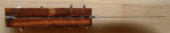 Die Konturen habe ich nun mit dem Bandschleifer bis auf etwa 2mm an die Markierung heran verfeinert. Dann habe ich den Block wieder mit doppelseitigem Klebeband an der Klinge befestigt und die 3mm Löcher auf das Holz übertragen. Dabei ist darauf zu achten, daß die innere und äußere Fläche der an die Klinge geklebten Schale absolut parallel verlaufen um sicherzustellen, daß später die Pins einwandfrei sowohl durch den Stahl als auch durch beide Griffschalen passen. Bei mir war das leider nicht der Fall, so daß ich bei einer Griffschale einige Löcher leicht oval erweitern mußte. Die dadurch entstandenen Ritzen habe ich später durch Füllen mit, mit Holzstaub gefärbtem, Zweikomponentenkleber cachiert.