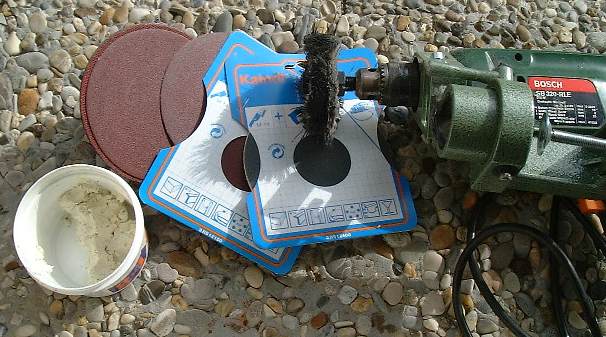 Die Polierscheibe mit der Aluminiumoxidpaste bestrichen und eimal über das ganze Messer (Stahl und Holz) poliert. Danach das Holz mit der Autopolitur behandelt und nocheinmal an die Politurscheibe. Um das Holz auch wirklich weitestgehend feuchtigkeitsresistent zu machen noch eine Behandlung mit dem Auto Pudding und eine Endpolitur mit einem Stück Stoff.